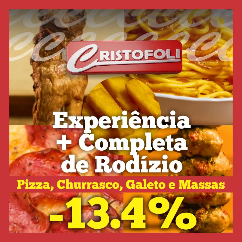 A Cristofoli oferece a experiência mais completa em rodízio. Galeto, Massas, Pizzas e Churrasco, tudo numa só sequência livre, por muito menos do que você imagina, e sem cobrar 10%.
